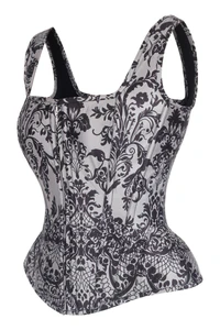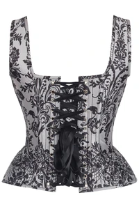 - Gothic Glamour: Silver satin corset with intricate black baroque print.